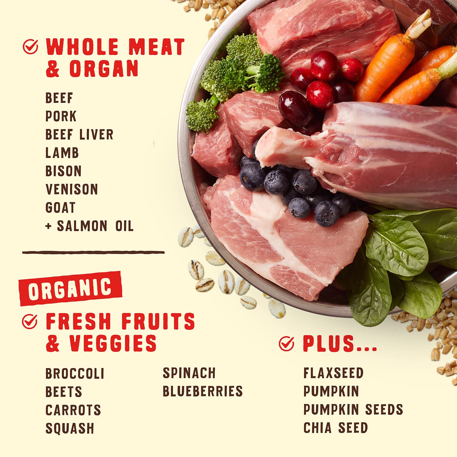 - Feed Your Dog’s Wild Side! Our Red Meat Recipe includes six animal protein sources that your dog will love: beef, pork, lamb, bison, venison and goat — perfect for dogs with poultry allergies